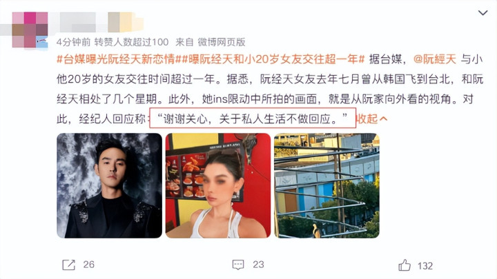 针对恋情传闻,阮经天的经纪人仅低调回应:“谢谢关心,关于私人生活不做回应。”