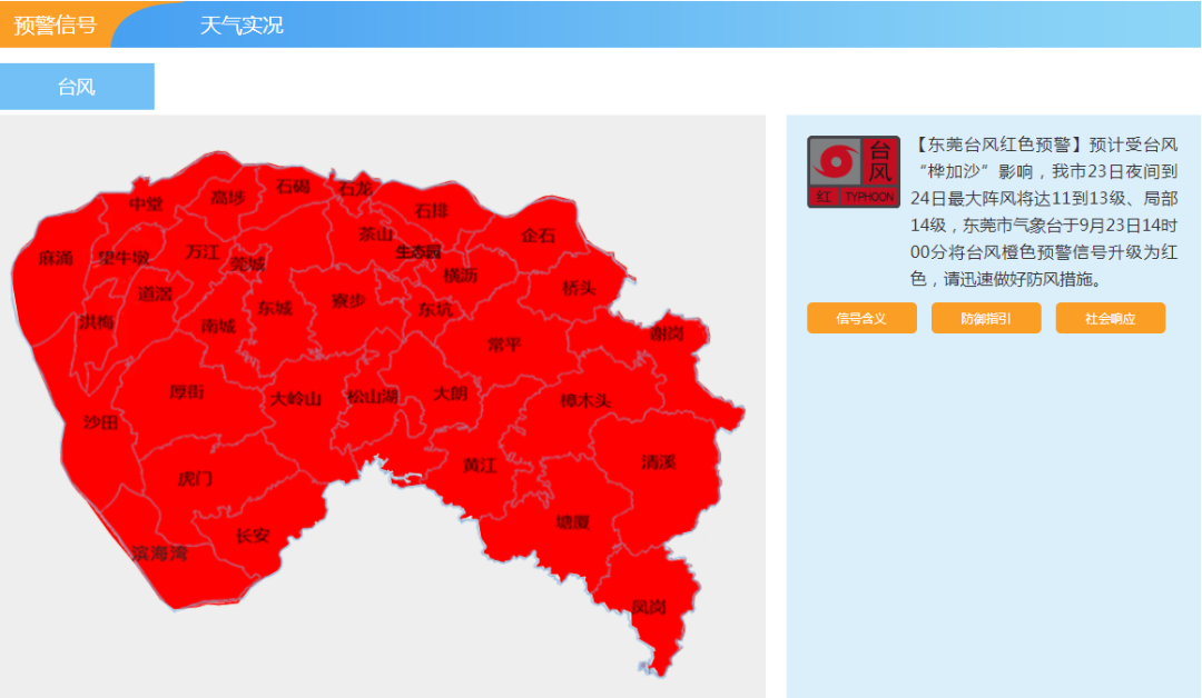 【东莞台风红色预警】预计受台风“桦加沙”影响传金所,我市23日夜间到24日最大阵风将达11到13级、局部14级,东莞市气象台于9月23日14时00分将台风橙色预警信号升级为红色,请迅速做好防风措施。